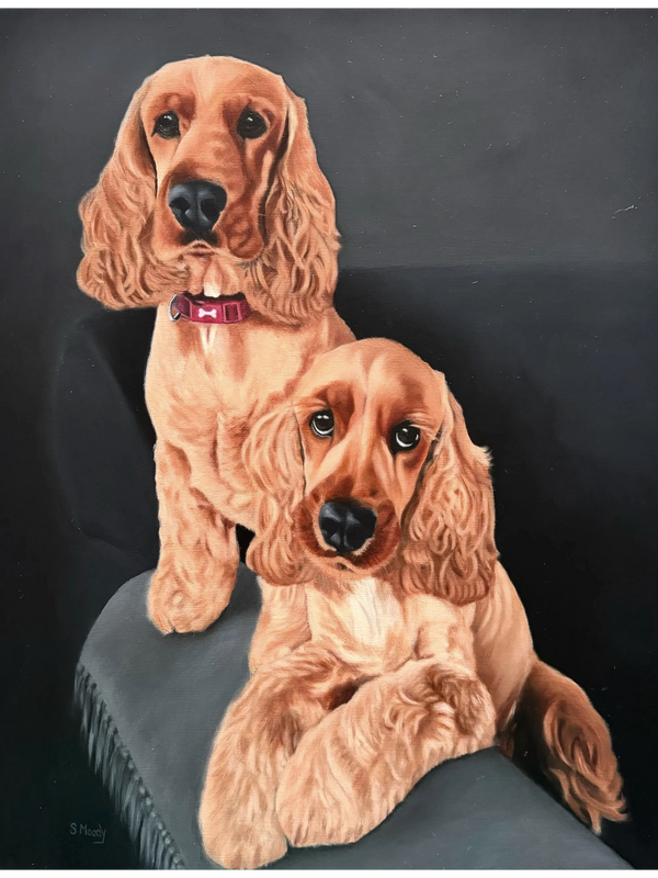 “I used Susie to do a commission on our two dogs having used her several years ago to paint a golden retriever we had at the time. After sending some pictures of our dogs, Susie consulted with my wife and I on how the painting should look. Susie listened to our brief and work began. We received several updates during the process. Towards the end when I was sure the painting was complete Susie would declare that she had some fine tuning to do before she felt ready to hand it over. A true perfectionist! On the reveal day we were delighted with the end result. You can pick up the character of each dog through the painting. Excellent work. We are very satisfied customers.”Nigel (Hugo & Harry).